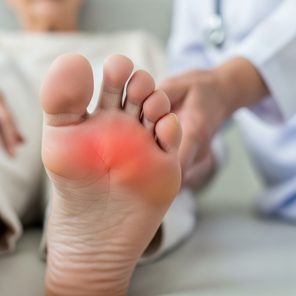 Cận cảnh khớp ngón chân cái của người lớn tuổi bị sưng to, tấy đỏ và da căng bóng, là triệu chứng điển hình của một cơn gout cấp tính.